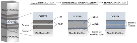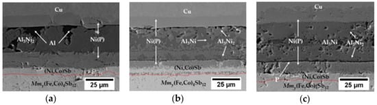 where t are the thicknesses of both nickel and aluminium layers, M are the atomic weights and ρ are elemental densities, i.e., 8.9 g/cm3 and 2.7 g/cm3 of Ni and Al, respectively. However, deviations from the theoretical model were expected as Ni(P) instead of pure nickel was used in this study. According to Equation (2), a symmetrical joint consisting of two 3.75 µm-thick Ni(P) layers and 17 µm-thick Al foil (Figure 1) should be enough to maintain a single Al3Ni2 phase. While it would be advantageous to completely consume the nickel layer to avoid any subsequent reaction with the skutterudite material, initial experiments indicated that an excess of nickel is required, as any excess aluminium can react with the thermoelectric to form the wider band gap [41] aluminium antimonide, increasing the contact resistance. Moreover, elemental nickel is also consumed by the formation of intermetallic compounds (IMCs) at the skutterudite–Ni(P) interface and its consumption at the interconnection side caused by the significant Cu solubility in Ni [42] at all concentration ranges. Therefore, thicker than calculated Ni(P) layers were deposited.