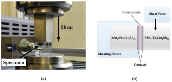 The mechanical strength of joints was assessed using specimens with the cross-sectional size of 2.5 mm × 2.5 mm by measuring apparent shear strength using MTS Criterion 43 (MTS Systems Corporation, Eden Prairie, MN, USA) at room temperature. The shear configuration was adapted according to ASTM D905 standard [33] which is designed to expose the assembly to direct contact with a shearing blade at the thermoelectric/joint interface, as depicted in Figure 2a,b. A shear load was applied by moving the blade perpendicularly to the longitudinal axis of the specimen with a speed of 0.2 mm/min. The apparent shear strength was calculated by dividing the maximum force applied by the joining area of at least two specimens of different joining conditions.