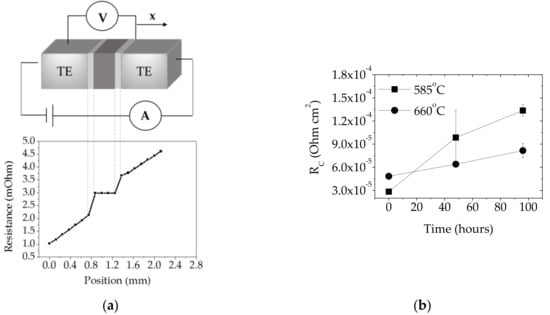 (a) Schematic illustration of four-point probe resistance set-up equipped with a scanning probe moving across the surface (x) where the contact resistance (Rc) is defined as the ratio of voltage drop across the contact to the current pulse applied to a pair of contacts; the graph below shows Rc measurement of the skutterudite specimen bonded at 660 °C for 4.6 min and (b) Rc evolution of metal interconnect–Mmy(Fe,Co)4Sb12 p-type contacts as a function of isothermal ageing time. Note: As-joined contacts are denoted as ‘0 hours’ specimens.