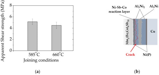 The mechanical strength of bonded specimens was evaluated by measuring apparent shear strength at room temperature adapted to the ASTM D905 standard [33]. As shown in Figure 5a, the apparent shear strength of 5.1 ± 0.5 MPa and 4.5 ± 0.5 MPa was achieved for specimens joined at 585 °C (≤ TM LOW) and 660 °C (= TM LOW) respectively. Taking into account that the mechanical properties of skutterudite–metallic interconnects are rarely reported in the literature, and the mechanical strength depends on several variables, i.e., measurement set-up configuration, it is challenging to quantitatively compare to other high-temperature thermoelectric junctions previously reported. Nonetheless, according to Ref. [48], the maximum bonding strength of 13.2 MPa was achieved in low-temperature (Pb, Sn) Te/Cu layers bonded by solid–liquid interdiffusion (SLID) using In-Ag system, suggesting that low mechanical reliability of IMCs-based joints might cause failure in long-term operations, thus requiring further improvement.