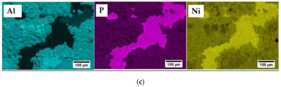 Scanning electron microscope along with EDS analysis was performed to observe the fractured interface and to understand the possible failure mode occurring within contacts, as presented in Figure 6a,b. The fracture seems to propagate in the mixed mode, along or very close to the Ni(P)–Al3Ni2 intermetallic interface and within the joining area (as schematically shown in Figure 5b) as the three distinct regions of Ni(P), Al3Ni2 and Al3Ni can be detected by the EDS elemental mapping images.