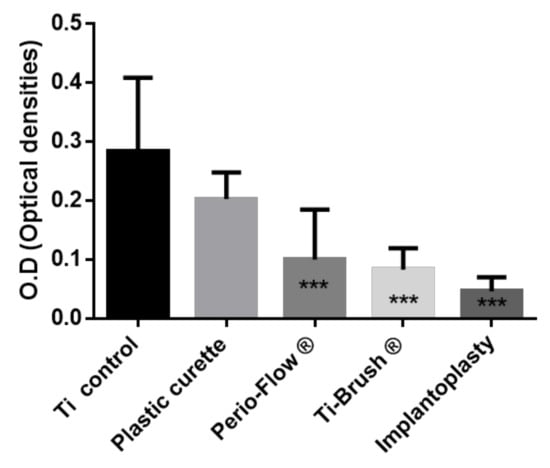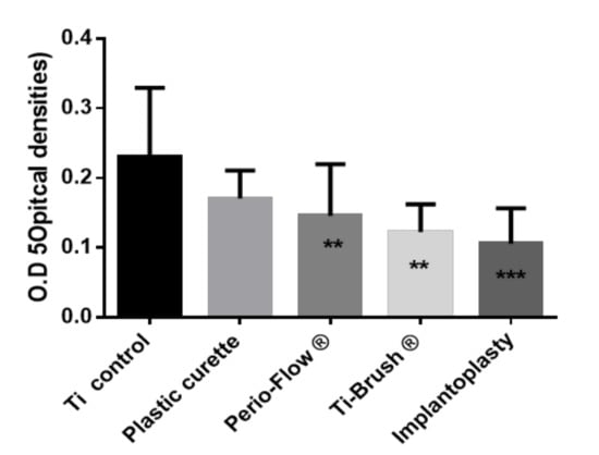 Therefore, the present in vitro study aims to compare the efficacy of four mechanical methods (a plastic curette, an air-abrasive device (Perio-Flow), titanium brush (TiBrush), and implantoplasty) on the removal of Streptococcus gordonii from titanium disks, and the bacterial recolonization of disks previously treated.