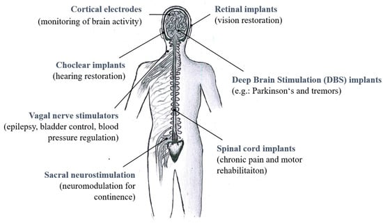 Sketch with examples of different types of neural implants in different sections of the human nervous system with examples of main clinical applications.