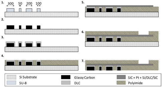 Microfabrication process used to fabricate the ultra-conformable polyimide-based ECoG devices with GC electrodes: (1) Lithographically patterned SU-8 disks with diameters of 50, 100, 200 and 300 µm and height of 13 µm. (2) Pyrolysis of SU-8 structures (1000 °C) to obtain GC electrodes. (3) PECVD (plasma-enhanced chemical vapor deposition) of 50 nm DLC (diamond-like carbon) onto GC electrodes. (4) First layer of polyimide (PI, 4 µm), patterned to open the vias to the GC electrodes. (5) PECVD of 50 nm SiC (silicon carbide) on the tracks of the devices, followed by evaporated platinum (Pt, 300 nm) and 50 nm Si/DLC/SiC. (6) Second layer of PI (4 µm), patterned to access the metal bump pads. (7) Buffered oxide etch (BOE) for releasing the devices from the silicon wafer.