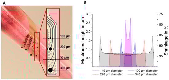 In addition to the ECoG electrodes, more disk-shaped test structures were made—on a separate silicon wafer using the same photoresist (SU-8) and the same protocol—for measuring their height before and after pyrolysis and quantifying pyrolysis-related shrinkage (Figure 3B). Similar to the ECoG electrodes, such test structures measured 13 µm in height before pyrolysis and had diameters of 40, 100, 220 and 340 µm. Results were obtained using a mechanical profilometer (Table S1, Supplementary Materials, where also the ratio between their lateral and surface area was calculated) and plotted in Figure 4, together with the values obtained from the actual ECoG electrodes. When this ratio is smaller than 1, the structures can be considered ‘short’ or low-aspect ratio structures; when it is greater than 10, instead, the structures are considered ‘tall’ or high-aspect ratio structures. When the lateral/surface area ratio is greater than 1 but smaller than 10, the studied geometries are known as ‘intermediate’ [20]. For low-aspect ratio geometries, vertical shrinkage (change in height) is expected to be more prominent than for intermediate and tall geometries. All the test structures and electrodes with diameter greater than 50 µm used in this study (i.e., 100, 200, 220, 300 and 340 µm) have lateral/surface area ratio < 1 and can thus be considered ‘short’ structures. Their vertical shrinkage ranges between 90 and 95%. The disks with diameters of 40 and 50 µm, on the other hand, have ratios of 1.3 and 1.04 (‘intermediate’ range) and their height after pyrolysis decreased by about 85% with respect to their height before pyrolysis. All the structures deformed during pyrolysis by sagging in the middle.