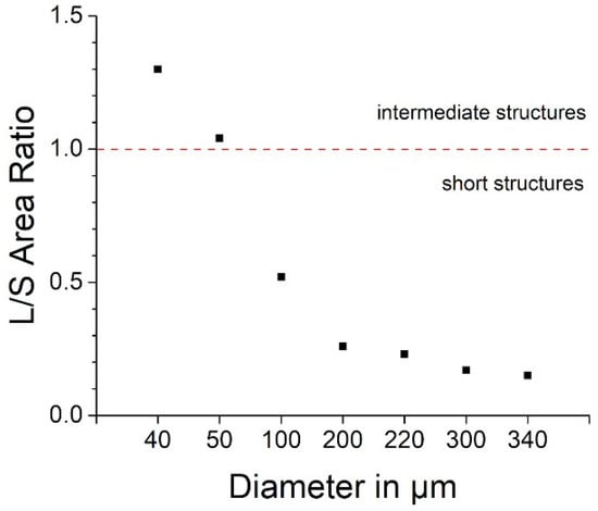 Lateral/surface area ratio calculated for not-pyrolyzed SU-8 cylindrical test structures with different diameters (ranging from 40 to 340 µm) and with a height of 13 µm before pyrolysis.
