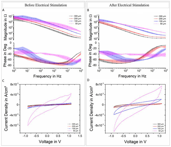 EIS (N = 4) and CV (representative cases) plots before (A,C) and after (B,D) electrical stimulation (10 million biphasic pulses maintaining a current density of about 0.15 mC/cm2). Shade regions represents standard deviation.
