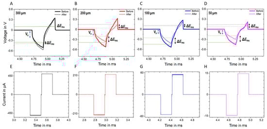 Voltage transient response of the four GC microelectrodes with diameters of 300 µm (A), 200 µm (B), 100 µm (C) and 50 µm (D), before and after stimulation (10 million pulses at 0.15 mC/cm2). (E–H) show the protocols used for the biphasic pulse stimulation of the different diameter GC electrodes.