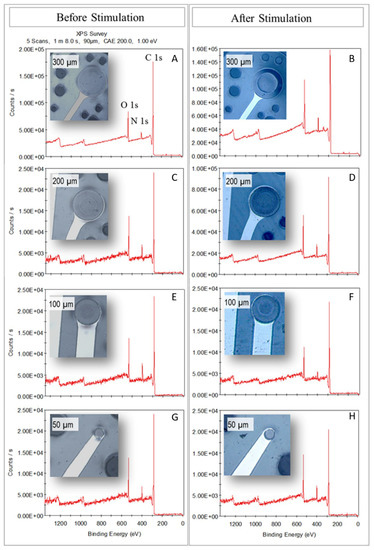 X-ray photoelectron spectroscopy (XPS) survey spectra of the four-diameter GC electrodes before (A,C,E,G) and after (B,D,F,H) stimulation. Insets show pictures of the electrodes with the correspondent diameter.