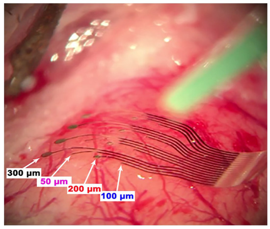 The conformable ECoG arrays were placed over the rat barrel cortex of five rats in several positions (an example in Figure 8) to test the ability of each electrode geometry to record neural activity independently of its distance from the signal source. The devices were tested first by simultaneously stimulating all the whiskers and then only single whiskers, with the aim of studying also the electrodes’ capability to detect and discriminate the response evoked by one single barrel of the rat cortex [32,33].