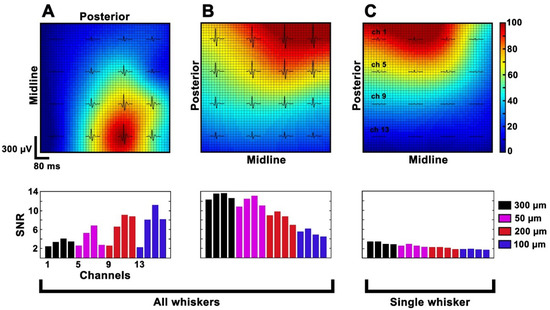 For each position, the location of the largest recorded SEP, identified as the signal source, moves on the electrode color-coded map consistently with the repositioning of the array on the cortex (Figure 9). When placed close to the signal source, in fact, each electrode diameter is able to record the greatest peak-to-peak amplitude. Consequently, the resulting signal-to-noise ratio (SNR) values (Figure 9, bottom row) do not depend on the electrodes’ dimensions but are highly correlated to the signal source location and to the intensity of the signal. On the other hand, when only single whiskers are stimulated (Figure 9C), smaller SEP amplitudes and lower SNR values are expected due to the reduced population of neurons involved in the task (with respect to the all-whisker’s case of Figure 9A,B) rather than to the electrodes themselves.