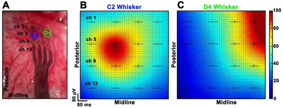(A) Picture of the array over the barrel cortex where the position of the barrels of interest are overlaid. (B,C) Interpolated maps of the averaged SEPs obtained after stimulating the C2 and the D4 whiskers showing the expected somatotopic shift. The colormap reflects the SEPs sizes normalized in the range [0, 100] independently for each experimental condition.