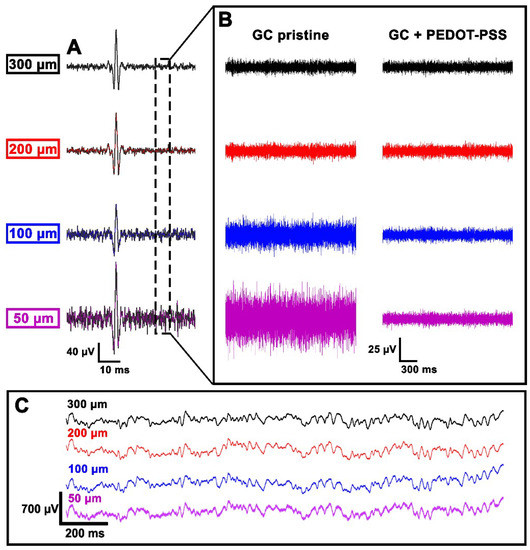When dealing with SEP recordings, no relevant difference between the recording performances could be associated to the different electrode diameters. Differently, a meaningful distinction between the diameters was noticed in the high frequency domain (Figure 11). In concordance with the trend emerged from the electrochemical characterization, the high frequency background noise band increased with the decrease of the electrode diameters, except for the transition between 300 and 200 µm, which did not show significant changes. In order to address the noise band increase, electrochemical deposition of PEDOT:PSS onto pristine GC electrodes was performed. As shown in Figure 11, a significant background noise reduction was observed for the 50- and 100-µm-diameter electrodes after the coating, making them comparable to the larger electrodes (200 and 300 µm in diameter) that remained basically identical (for amplitude ranges see Table S4 of the Supplementary Materials). The correlation between the SNR value associated with one electrode and its relative position to the signal source was observed in all five rats.