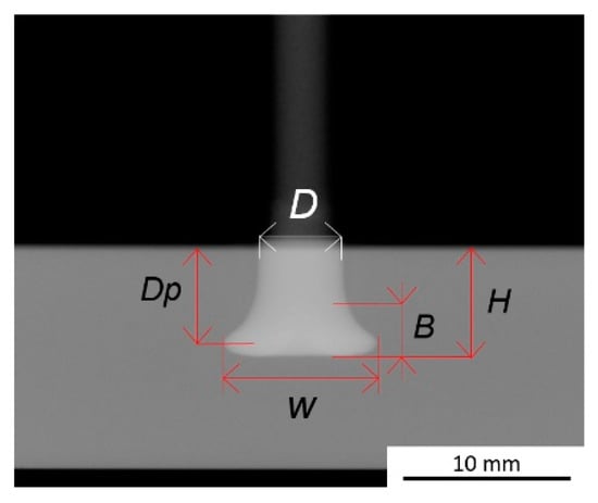 where H is the penetration depth, B the deformed tip height (a dimension measured from the beginning of changes in the original rivet diameter, D, until the bottom of the deformed rivet tip, Figure 2), W the maximum deformed width of the rivet tip, and D the original rivet diameter.