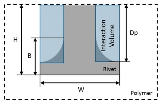 where the new term Dp is used, representing the anchoring depth (i.e., the depth until the maximum width of the rivet tip), differing from the measure previously used based on B. Figure 3 schematically illustrates the limitation of the previous VR calculation procedure. For bell-shaped deformations of the rivet tip, using the B parameter leads to a considerable reduction of the polymeric interaction volume being considered. While by using Dp in the proposed VR(U) equation, a closer to reality and more robust estimation across a wide range of rivet tip deformations and geometries can be achieved, since Dp corresponds to the depth up to the maximum width of the deformed rivet tip. The limit cases where VR and VR(U) are equal to zero, entails that no rivet deformation has occurred, i.e., no interaction volume is present (Figure 3), and W has the value of the original rivet diameter, D. For both VR and VR(U) to achieve a value of one, some limit conditions must be met. The initial value of the diameter, D, would necessarily tend to the value of zero, with a W higher than D, for both ratios. For VR a B value close to zero would also need to be observed. In the case of VR(U), Dp would also tend to the same value as H.