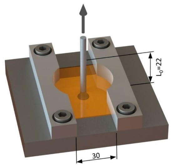 To evaluate the global mechanical performance of the specimens produced, a quasi-static pullout tensile testing set-up was used (adapted from ISO 6892 []). The tests were conducted at room temperature using a Zwick/Roell 1478 universal testing machine (Zwick/Roell, Ulm, Germany) equipped with a 100 kN load cell. A customized clamping adapter, illustrated in Figure 4, was used to distribute the load over the polymeric plate. The specimens were tested at a rate of 1 mm/min and room temperature conditions, with a grip distance L0 of 22 mm.