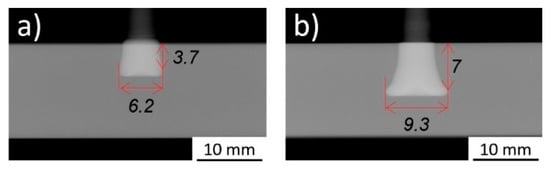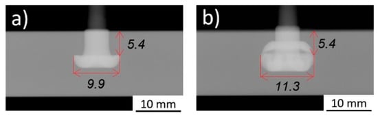 X-ray tomography of: (a) Condition 33 (RS = 19,000 rpm; FT = 1.8 s; FoT = 1.5 s; FF = 1500 N; FoF = 4500 N); (b) Condition 36 (RS = 19,000 rpm; FT = 1.8 s; FoT = 1.5 s; FF = 2500 N; FoF = 5700 N).