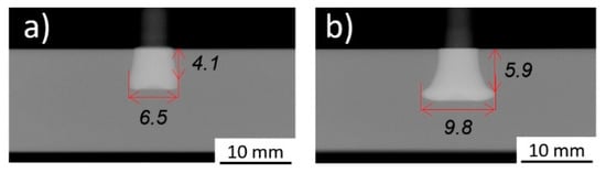 X-ray tomography of: (a) Condition 6 (RS = 20,000 rpm; FT = 1.6 s; FoT = 2 s; FF = 2000 N; FoF = 5100 N); (b) Condition 7 (RS = 18,000 rpm; FT = 2 s; FoT = 2 s; FF = 2000 N; FoF = 5100 N).