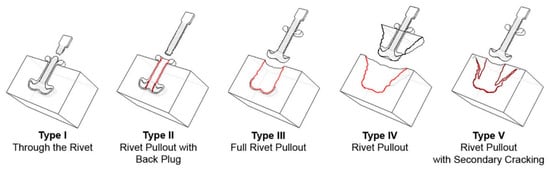 Different joint failure types were observed for the tested specimens. Figure 7 schematically represents the current classification of the several failure modes reported in the literature [] for metallic-insert friction riveted joints.