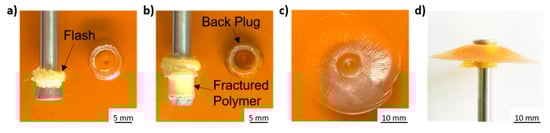 Examples of failure modes observed: (a) Condition 7 (RS = 18,000 rpm; FT = 2 s; FoT = 2 s; FF = 2000 N; FoF = 5100 N), full rivet pullout failure; (b) Condition 30 (RS = 19,000 rpm; FT = 2.2 s; FoT = 1.5 s; FF = 2500 N; FoF = 4500 N), rivet pullout with back plug; (c) Condition 13 (RS = 18,000 rpm; FT = 1.6 s; FoT = 2 s; FF = 3000 N; FoF = 5100 N), polymeric plate, rivet pullout failure; (d) Condition 13, side view of rivet and detached polymer, rivet pullout failure.