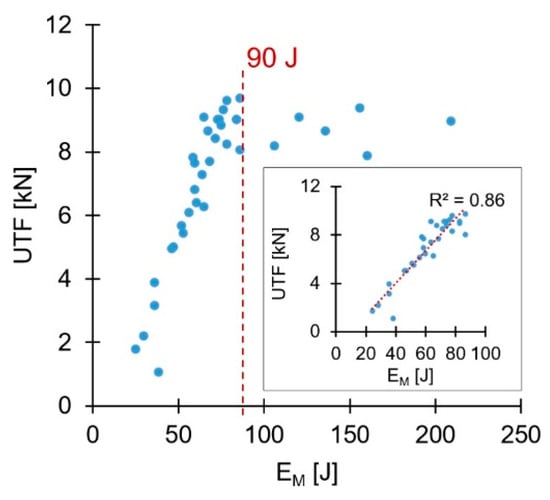 Energy input during friction riveting has been addressed in the literature [], with some correlations being established with the joining parameters used. Nonetheless, no correlation between the energy input and mechanical performance has been analyzed. Therefore, a notion of energy efficiency, concerning the joint quasi-static mechanical performance, is then necessary. This could minimize the energy input and reduce costs (e.g., reduce power consumption, joining time.) when producing joints with higher mechanical performance. Hence, the total energy inputs (EM), previously published for the present conditions in Part I, were evaluated in terms of UTF. Figure 11 presents the correlation between the total energy input and the respective UTF values.