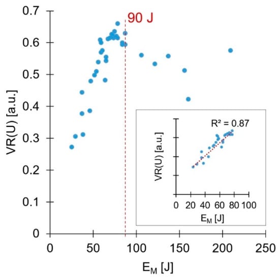 Correlation between improved volumetric ratio, VR(U), and total energy input (EM). In detail, correlation for the energy efficient range (EM ≤ 90 J).