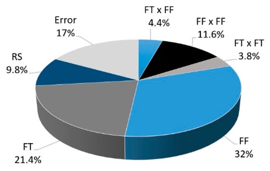 The individual contributions of the terms present in the model and its total error are shown in Figure 14. The largest contribution (32%) to the achieved UTF comes from a linear term, the FF parameter. One quadratic term, FF × FF, also plays an important role with 11.6%.