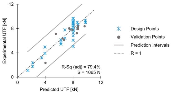The model-predicted values for UTF were correlated with those obtained experimentally in Figure 15. In this validation plot, it is visible that the majority of the data points fall within the prediction limit lines (solid grey), within which the model can predict a single response observation []. A set of 13 additional validation joints supported this trend.