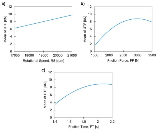 Main effects plots of linear model terms for the UTF response, with: (a) Rotational Speed; (b) Friction Force; and (c) Friction Time.