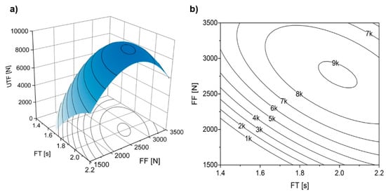 It seems that only a small area (peak of the surface in Figure 17a) of both FT and FF ranges can maximize the UTF. This roughly elliptic area is located around FF values of 2750 N and FT around 2.0 s. Given the orientation of the curves (Figure 17b), smaller variations of FF than those of FT may result in UTF values outside the peak and optimal response region. This behavior was also seen in the main effects plots (Figure 16b,c), where effect of FF displayed a more pronounced curvature than FT. At low levels of both parameters, the resulting low energy input will not promote sufficient plastic deformation on the rivet tip to resist the pullout solicitation, hence the low UTF for this left lower quarter parameter region (e.g., Condition 1, seen in Figure 5, with a VR(U) = 0.28 and EM = 24 J). In Figure 17b, following a 1:1 correlation between FF above 3000 N and FT higher than 2.0 s the UTF begins to gradually decrease to around 6000 N for maximum values of FF and FT. Since high levels of these parameters tend to produce over-deformation on the rivet tip, e.g., Condition 15, seen in Figure 12a. This is also in accordance to the proposed threshold of energy efficiency of 90 J (see Figure 11 and Figure 12 for reference).