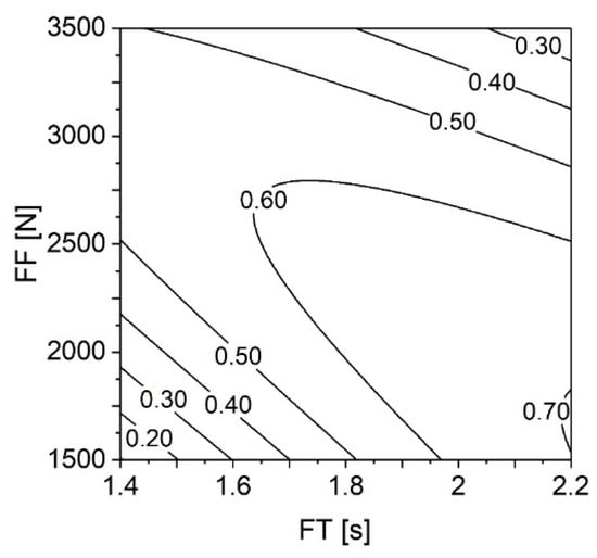 As shown in the previous section, RS has a linear increasing effect on the UTF (Figure 16a). Given this fact, in order to maximize the UTF response, Figure 19 displays a contour plot analogue to that of Figure 17b, now with RS set to its maximum (21,000 rpm). This allows to investigate how this increase of RS influenced the contour lines across the ranges of both FT and FF. The remaining parameters (FoT and FoF) were set to their central values (1.5 s and 4500 N, respectively), considering that these did not demonstrate a statistically significant effect on the UTF response.