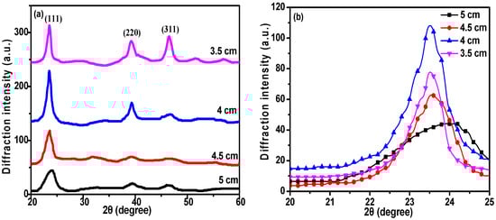 X-ray diffraction (XRD) analysis of CdTe films deposited at different substrate-target distances. (a) XRD patterns, and (b) comparison of the main peak for all samples.