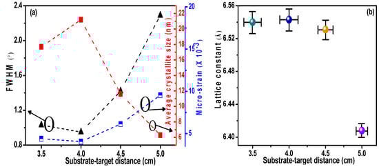 Crystal parameters of CdTe films prepared at various substrate-target distances. (a) Full width at half maximum, average crystallite size, and micro-strain; (b) lattice constant.