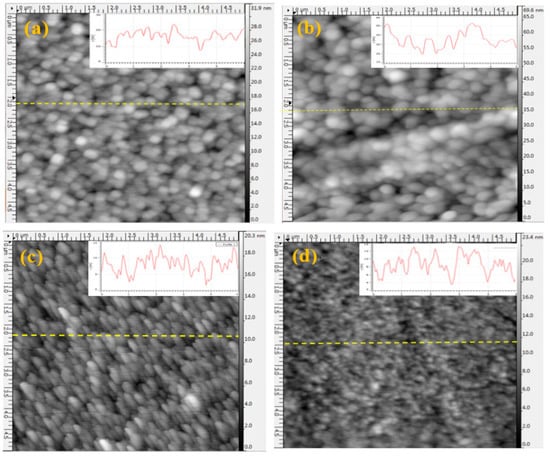The two- and three-dimensional surface morphologies of the CdTe films are exhibited in Figure 5 and Figure 6. The average grain size and root mean square (RMS) roughness of the films were calculated by Gwyddion image software, revealing a smooth and flat CdTe film surface for Dts = 5 cm that yielded an average grain size of 7.88 nm and an RMS roughness of 2.29 nm. As Dts decreases from 5 to 4 cm, the outline of the grains becomes distinguishable and exhibits a spherical morphology. Additionally, compact films deposited at Dts = 4 cm (with an average grain size of 35.25 nm and RMS roughness of 9.66 nm) are obtained, which effectively prevent the occurrence of pinholes on the film surface. However, for Dts = 3.5 cm, the surface state of the CdTe films (with an average grain size of 16.26 nm and RMS roughness of 3.89 nm) was not a further improvement, due to the excessive kinetic energy of the CdTe molecules and significant bombardment from sputtering particles. The inset images in Figure 5 represent the profiles of film surfaces that demonstrate the fluctuation of morphology and surface roughness. Furthermore, the specific parameters are listed in Table 3.