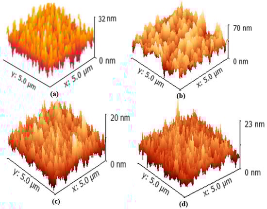 Three-dimensional surface morphologies of CdTe films deposited at different substrate-target distances, Dts. (a) 3.5 cm; (b) 4 cm; (c) 4.5 cm; and (d) 5 cm.