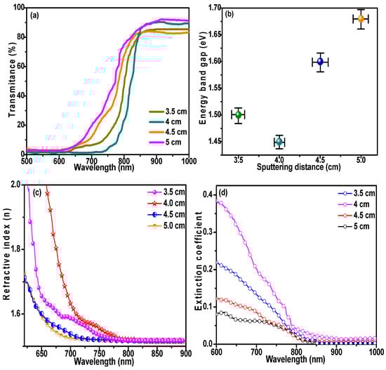 Optical properties of CdTe films prepared at different substrate-target distances. (a) Transmission spectrum; (b) energy band gap; (c) refractive index (n); and (d) extinction coefficient.