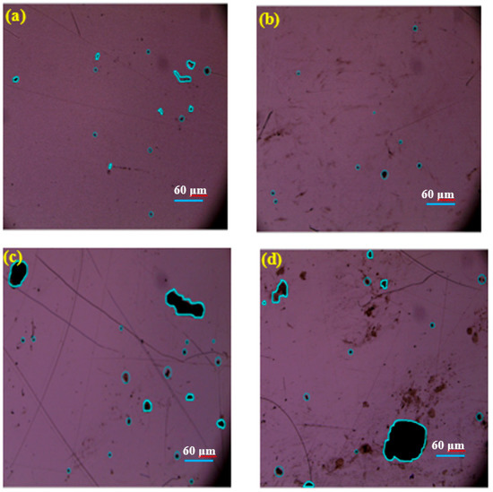 Research has proven that the formation of pinholes in CdTe films reduces the efficiencies of solar cells based on CdTe films due to shunting effects that produce short-circuits. Pinhole areas contain various defects that enhance the process of capturing electron-hole pairs, resulting in a lower effective number of photo-generated carriers [,,]. Before investigating the influence of pinholes on the electrical properties of CdTe films, the mechanism of pinhole formation should first be explained. Pinholes can be divided into two categories: natural and artificial []. The former is mainly associated with the coalescence of grains, while the latter is attributed to damage from handling after deposition, resulting in scuffs and scratches on the film surface. The distribution of pinholes on the film surface are shown in Figure 8. It was found that the number of pinholes formed dropped significantly to the lowest density of pinholes (defined as the number of the pinholes area divided by the total area), which was 0.026 when Dts was 4 cm. It was concluded that the number of pinholes on the CdTe film surface could be significantly decreased by adjusting the sputtering distance, instead of requiring technology such as pinhole fillers with negative photoresist.