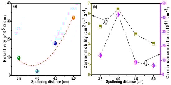 Electrical properties of CdTe films prepared at various substrate-target distances. (a) Resistivity; (b) carrier mobility.