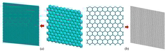 - Hemmasizadeh, A.; Mahzoon, M.; Hadi, E. A method for developing the equivalent continuum model of a single layer graphene sheet. Thin Solid Films 2008, 516, 7636–7640. [Google Scholar] [CrossRef]