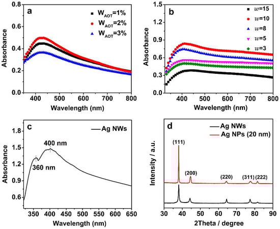 UV-Vis spectra were recorded with a UV-2010 UV-vis spectrophotometer (Hitachi, Tokyo, Japan) to find the optimized mass fractions of AOT (WAOT), and to confirm the formation of silver nanocrystals. Scanning electron microscope (SEM) images were collected by a Hitachi S-4800 electron microscope (Tokyo, Japan) after the samples were dropped on to silicon wafers. The powdered samples were subjected to X-ray diffraction (XRD) studies on an X’pert PRO XRD (Malvern Panalytical, Malvern, UK) to identify their structures. The diameter of the synthesized silver nanocrystals was probed by dynamic light scattering (DLS) with a Brookhaven 90 Plus (Brookhaven Instruments Corp., New York, NY, USA) in an ethanol solvent.