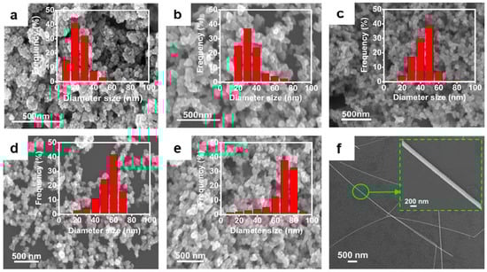 (a–e) Scanning electron microscopy (SEM) images of the Ag NP that synthesized at w = 3, 5, 8, 10 and 15, respectively. The inserts show the size distributions, which were measured by dynamic light scattering (DLS) in ethanol based on intensity and had been normalized to a frequency of size distribution. (f) SEM image of the Ag NW that synthesized at w = 25. In all six experiments, the mass fractions of AOT are 2%.