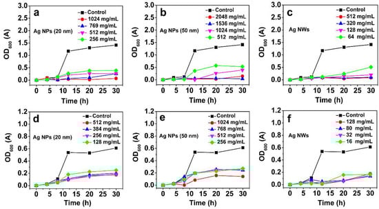 Growth curves of E. coli (a–c) and S. aureus (d–f) versus concentration.