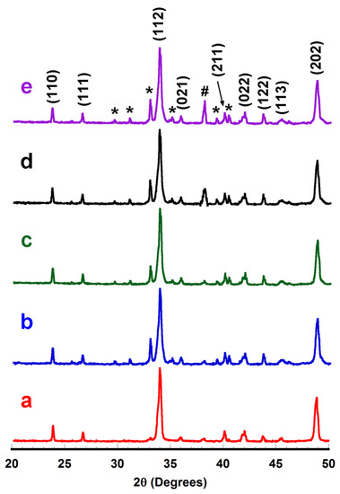 Powder X-ray diffraction (XRD) patterns, given in log scale on the y-axis, of Ca0.9Yb0.1MnO3 + x wt.% Ag samples after sintering for x = (a) 0; (b) 1; (c) 3; (d) 5; and (e) 10. Diffraction planes identify the peaks of the Ca0.9Yb0.1MnO3 phase, while * and # show those corresponding to Ca2Mn2O5 and metallic Ag, respectively.
