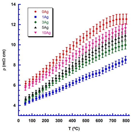 Changes in electrical resistivity with temperature and Ag content are presented in Figure 4, together with their estimated errors (4%), in agreement with previously determined errors for this measuring system [34].