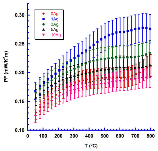 Using these electrical data, sample performances were calculated using their PF values. a PF variation with temperature as a function of Ag content is illustrated in Figure 6, together with estimated errors of around 9%.