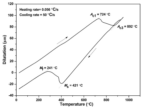 Dilatometric curve of the tested steel austenitized at 940 °C for 10 min and cooled at 50 °C/s, showing ascertaining the start and finish temperatures of phase transformation by tangent method.