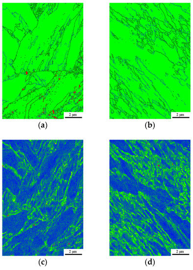 (a,b) EBSD phase maps of the DQ and HS specimens, green color refers to BCC and red color refers to FCC, the black lines are high-angle boundaries with misorientation angles over 15° while the blue lines are low-angle boundaries with misorientation angles between 2° and 15°; (c,d) EBSD-KAM of the DQ and HS specimens. (a,c) DQ; (b,d) HS.