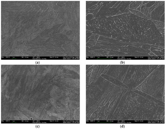 SEM micrographs of the (a,b) DQ and (c,d) HS specimens, showing the morphology and distribution of fine carbides.