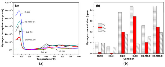 - TDS analysis revealed that hydrogen-charging caused an additional remarkable hydrogen desorption peak at round 65–80 °C for both the DQ and HS specimens. The diffusible hydrogen concentration (CHr) of the HS specimen is higher than that of the DQ specimen, and CHr was lowered after low-temperature tempering.