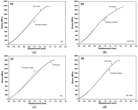 Figure 9 gives the typical SSRT curves obtained for the notched sheet specimens under different conditions. Since the specimens were notched, which is regarded to be appropriate to reflect the susceptibility to HE of high strength steels [26,32], the displacement is short and thus showed an early fracture before distinct yielding and necking, revealing the remarkable effect of notch on the tensile behavior. Hydrogen-charging remarkably deteriorated the tensile behavior, that is, both the maximum notch tensile stress and the fracture displacement were lowered.
